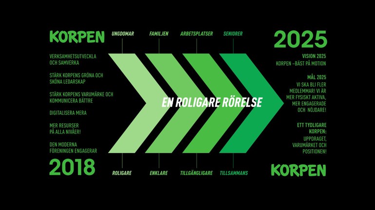 I december 2016 påbörjade förbundsstyrelsen ett framtidsorienterat, lärande och inkluderande samtal inom Korpen som ska utmynna i en ny strategi 2018-2025. Huvudfrågan är och var: hur ska förändringsresan Fokus Korpen fortsätta och hur hänger den ihop med Svensk idrott 2025?