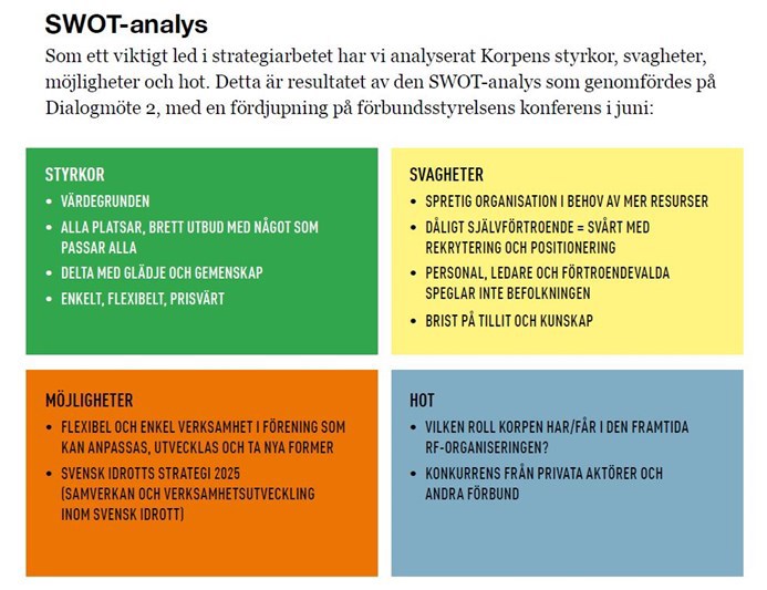 • Genomfört en SWOT-analys (på Dialogmöte 2 med fördjupning på förbundsstyrelsekonferensen i juni).